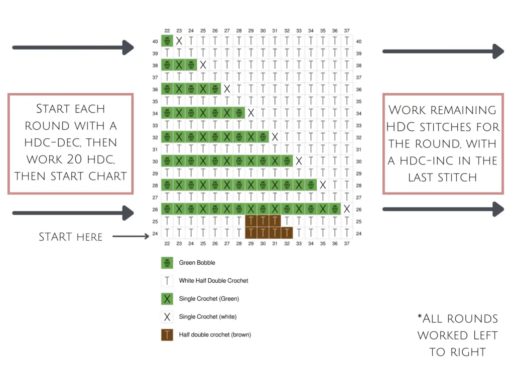 Round 30: Hdc-dec over the first 2 sts, 1 hdc in the next 20 sts (switch to green), work [bo in the next st, sc in next] 6 times (on the 6th bobble, pull through with white and work the last sc with white), 1 hdc in the next 15 sts, hdc-inc in the last st. Sl st to join. Ch 1, DO NOT TURN. <50 sts>