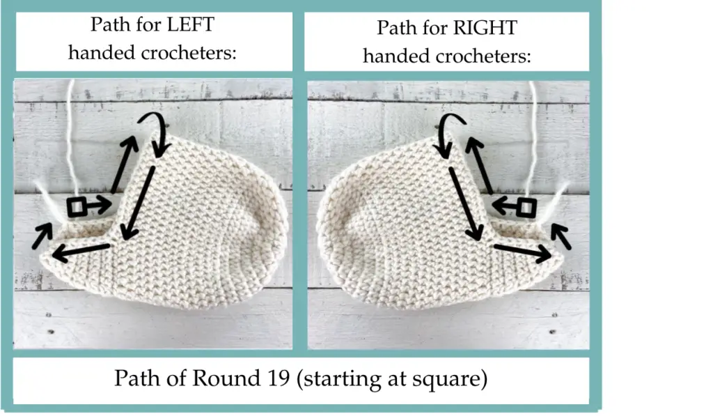 BOTH LEFT AND RIGHT HANDED CROCHETERS SHOULD FOLLOW THE SAME WRITTEN INSTRUCTIONS FOR ROUND 19, BUT NOTE THAT THE DIRECTION OF YOUR PATH WILL BE OPPOSITES (SEE PICTURE BELOW)