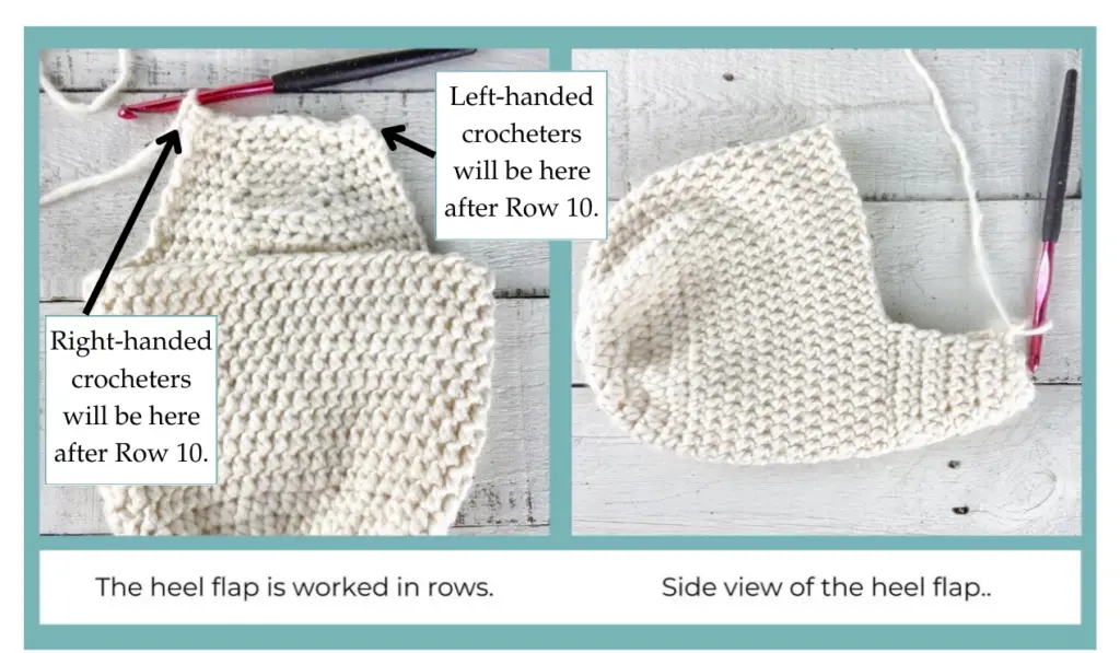 Tilt work so that you are working back up the other side of the heel. Evenly space 5 hdc along the row ends.