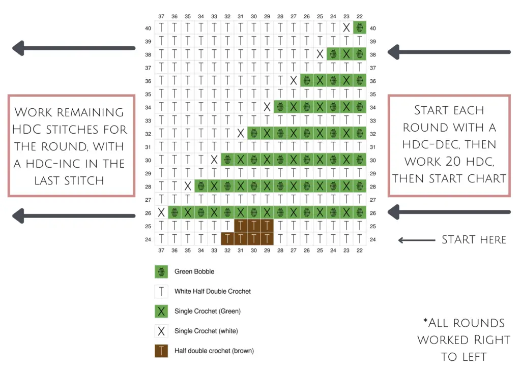 Round 26: Hdc-dec over the first 2 sts, 1 hdc in the next 20 sts (switch to green), work [bo in the next st, sc in next] 8 times (on the 8th bobble, pull through with white and work the last sc with white), 1 hdc in the next 11 sts, hdc-inc in the last st. Sl st to join. Ch 1, DO NOT TURN. <50 sts>