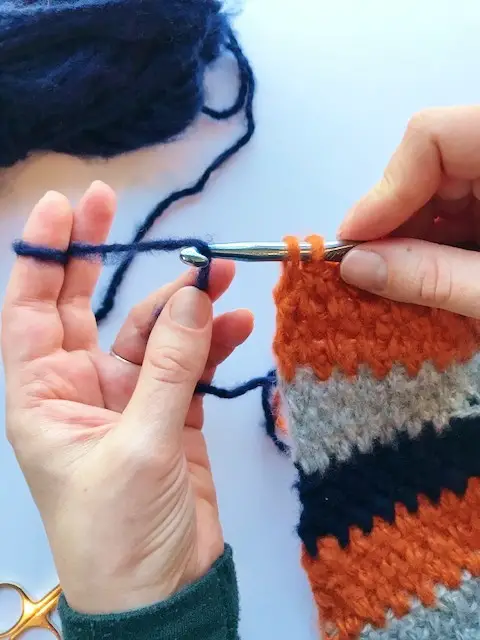 - When a color change is made, the tails of the two colors are crocheted over for the first row. The stitches of the second row are then made by placing your hook under the tails. The tails are held securely by this zig-zag technique with no ends to weave in! Daisy Farm Crafts has an excellent video tutorial describing this method. Find it here (https://www.youtube.com/watch?v=GL0KbDko-jk).