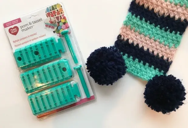 Make four 4” pom poms in your choice of color and attach one to each corner of the scarf. Pom Pom makers are handy when making several pom poms, but aren’t necessary. This YouTube tutorial shows how to make easy pom poms using only common household materials: https://www.youtube.com/watch?v=zok9hqyhTQ4