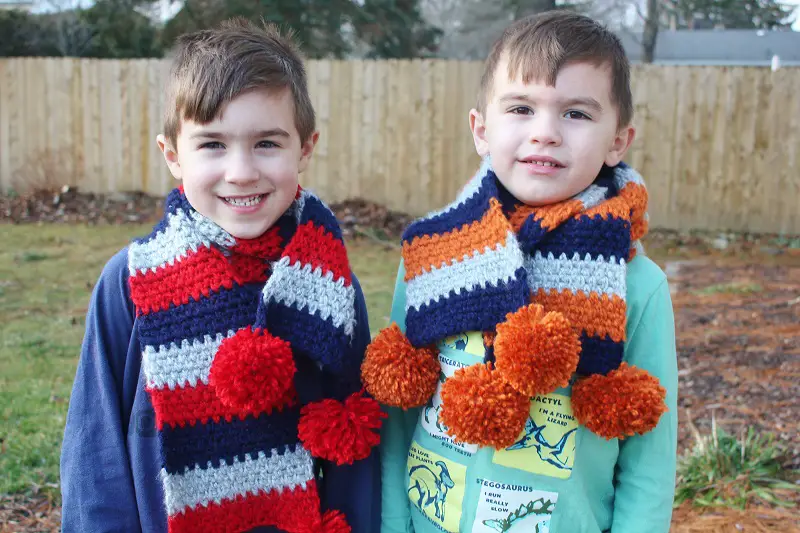 - As written, the scarf is sized for ages 5 – 8, but the length can be modified by adding more rows. A good rule of thumb is to make the scarf length equal to the wearer’s height. Width can be modified by changing the number of starting chains.